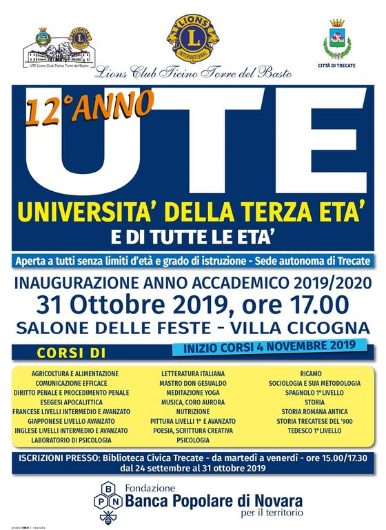 Il Comune di Trecate, in collaborazione con l’associazione UTE Lions Club Ticino Torre del Basto, informa dell’avvio del 12° anno accademico dell’Università della Terza Età, aperta a tutti, senza limiti di età e grado di istruzione.