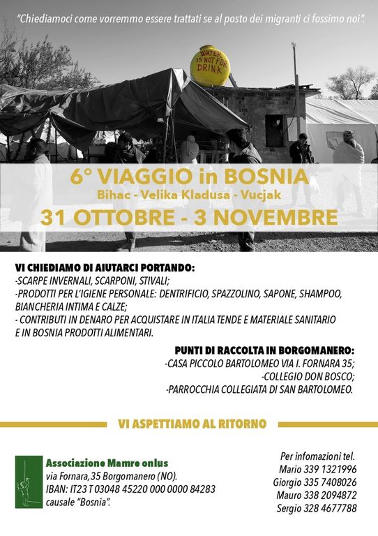 Settimo viaggio umanitario in Bosnia promosso dall'associazione Mamre: meta, dal 31 ottobre al 3 novembre, Bihac, Velika Kladusa e Vucjak. «Chiediamo a tutti di aiutarci ad aiutare i migranti ospitati nei campi allestiti in queste località - afferma il presidente di Mamre Mario Metti - portando scarpe invernali, scarponi e stivali; prodotti per l'igiene personale come dentifrici, spazzolini, sapone, shampoo, biancheria intima e calze; e contributi in denaro per acquistare in Italia tende e materiale sanitario e in Bosnia prodotti alimentari». Tre i punti di raccolta a Borgomanero: casa "Piccolo Bartolomeo" (via Ignazio Fornara 35, frazione Santo Stefano), collegio "Don Bosco" e la Parrocchia di San Bartolomeo. Info: Mario 339.1321996; Giorgio 335.7408026; Mauro 338.2094872; e Sergio 328.4677788.