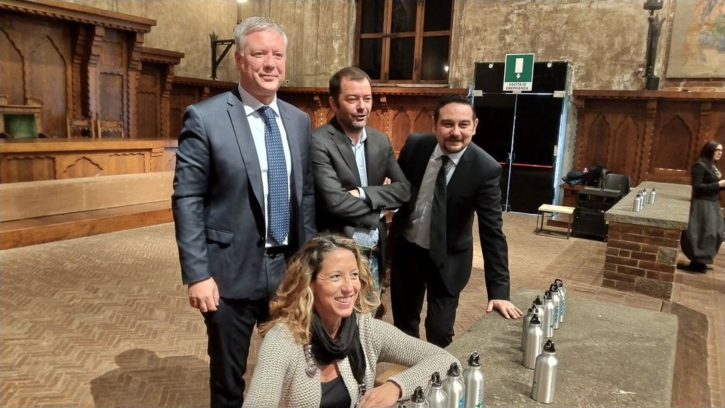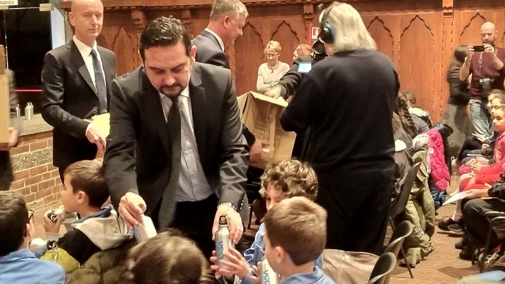 Arengo del Broletto brulicante di bambini questa mattina per l’avvio di una iniziativa dalla forte impronta ecologica promossa dal Comune di Novara, da Acqua Novara Vco e da Assa: cinquemila borracce in alluminio donate agli alunni delle scuole primarie di Novara, per invitarli ad assumere comportamenti ecologicamente sostenibili. Le prime borracce sono state consegnate oggi ad una rappresentanza delle scuole elementari dal Sindaco Alessandro Canelli, con l’assessore all’Istruzione Valentina Graziosi, il presidente di Acqua Novara Vco Emanuele Terzoli e il presidente di Assa Yari Negri.