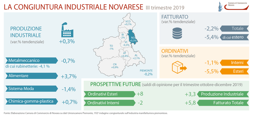 Luci ed ombre per l’industria manifatturiera novarese nel terzo trimestre dell’anno: tra luglio e settembre 2019 si riscontra una sostanziale stabilità della produzione, con una variazione del +0,3% rispetto allo stesso periodo dell’anno precedente, mentre il fatturato evidenzia un calo del -2,2%. Rispetto alle altre aree piemontesi coinvolte dalla 192a “Indagine congiunturale sull’industria manifatturiera”, Novara si posiziona a metà nella classifica delle performance provinciali relative alla produzione, guidate da Alessandria (+2,1%) con risultati eterogenei per i vari territori e una media regionale del -0,2%. Meno favorevole, invece, il posizionamento relativo al fatturato, che vede Novara collocarsi all’ultimo posto, a fronte di una media complessiva del +0,6%. L’indagine ha coinvolto nel Novarese 225 imprese, per un totale di oltre 10.700 addetti ed un fatturato superiore ai 3,7 miliardi di euro. «L’andamento dell’industria manifatturiera provinciale si dimostra altalenante anche nella seconda parte dell’anno» commenta Maurizio Comoli, presidente della Camera di Commercio di Novara. «La produzione si attesta su valori stazionari, mentre il fatturato evidenzia una flessione più significativa rispetto al periodo aprile-giugno , interrompendo così la lunga serie di incrementi consecutivi messi a segno nei trimestri precedenti. Le imprese guardano al futuro con prudenza, vista anche l’incertezza degli scenari geopolitici, in continua evoluzione. Siamo di fronte a un quadro che rischia di bloccare gli investimenti e quella fisiologica propensione al rischio, distintiva dell’attività d’impresa, che deve invece poter contare su un contesto di supporto favorevole per esprimere il suo potenziale di sviluppo ».