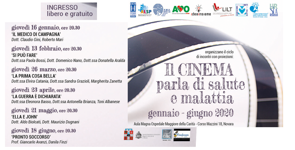 Le conferenze aziendali di partecipazione dell’Azienda Ospedaliero-Universitaria Maggiore della Carità di Novara e dell’Azienda Sanitaria Locale Asl– Novara presentano il progetto “Il cinema parla di salute-malattia”, realizzato dalle associazioni di volontariato: ABIO (Associazione per il Bambino in Ospedale), ALPS (Associazione per la Lotta alla Sofferenza psichica), AMA (Associazione Malati Alzheimer Novara), AVO (Associazione volontari ospedalieri), Associazione IDEA INSIEME, LILT (Lega Italiana per la Lotta contro i Tumori), Associazione tutela dei diritti del malato, UGI (Unione Genitori Italiani contro il tumore dei bambini), URSLA (Uniti per la ricerca sulla sclerosi laterale amiotrofica).
