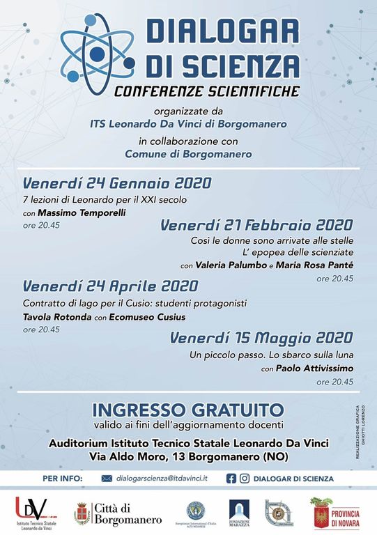 Riparte il progetto Dialogar di Scienza nella sua II edizione, da venerdì 21febbraio al 15 maggio, con la novità dell'organizzazione da parte degli studenti in collaborazione con il Comune di Borgomanero e il sostegno della provincia di Novara. Quattro le serate previste che si terranno tutte il venerdì sera alle 20.45 presso l'Auditorium dell'Istituto in via Aldo Moro 13, di Borgomanero.