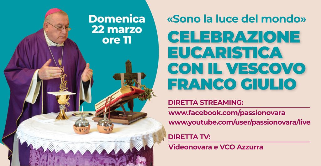 Sarà trasmessa in diretta, in tv e in streaming, domenica 22 marzo alle ore 11 la celebrazione della messa presieduta, nel palazzo episcopale di Novara, da mons. Franco Giulio Brambilla. «“Sono la luce del mondo”. Le parole di Gesù che dona la vista all’uomo cieco dalla nascita, proposte in questa liturgia – spiega mons. Brambilla – ci invitano a rischiarare la notte del tempo che stiamo vivendo». La diretta sarà visibile in tv su Videonovara e VCO Azzura, e in streaming sui canali Facebook e Youtube di Passio (per informazioni vedi www.passionovara.it).