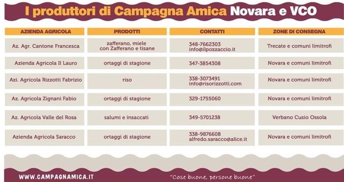 In questo momento di difficoltà e di bisogno gli agricoltori di “Campagna Amica” delle province di Novara e Verbano Cusio Ossola si mettono a disposizione con consegne a domicilio.