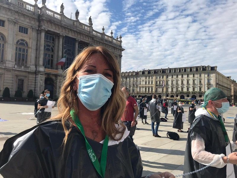 “Onoriamo le perdite che abbiamo avuto con 40 bare, sono le cicatrici che ci portiamo dentro e nessuno ci risarcirà mai” urla al megafono Francesco Copolella, segretario del Nursind Piemonte. L’accusa è pesantissima. “Oggi quelli della prima linea, quelli del fronte, quelli che avete mandato a combattere una guerra nudi e senza difese, quelli che chiamate eroi, li avete dimenticati”. Il sindacato pone l’attenzione sui diritti negati in questi due mesi: dalle ferie abolite ai congedi, passando per i tamponi non effettuati e la quarantena abolita.