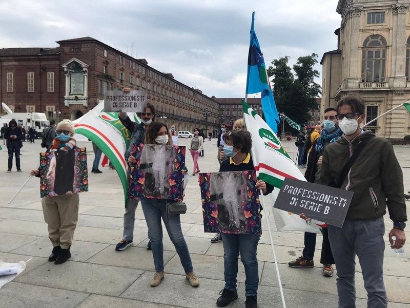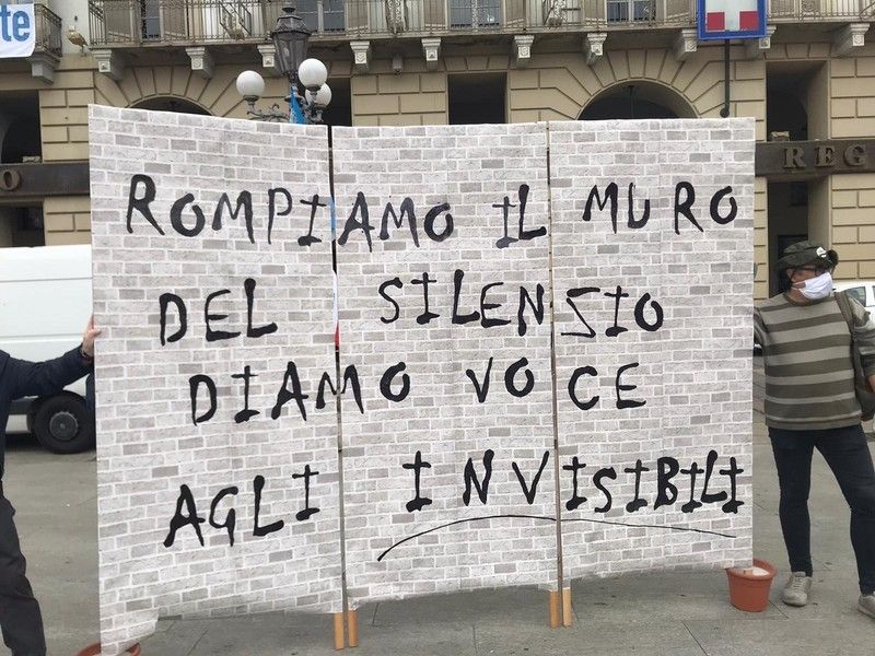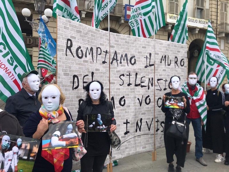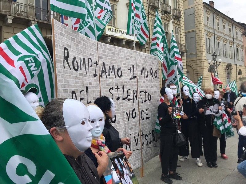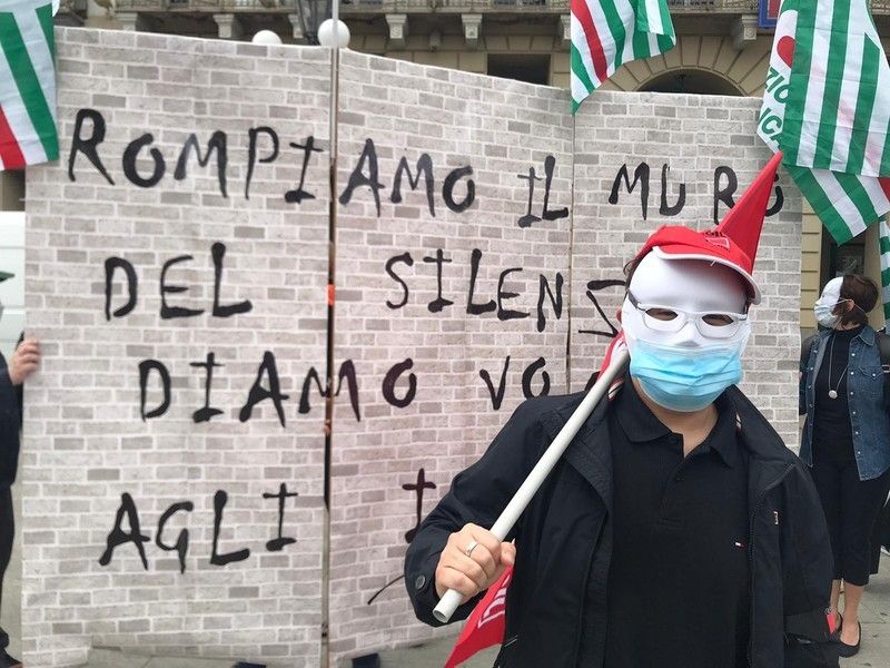 "Rompiamo il muro del silenzio, diamo voce agli invisibili". Con una maschera calata sul viso e le bandiere al vento, sotto la Regione Piemonte sfilano i dipendenti del settore sociosanitario assistenziale privato.