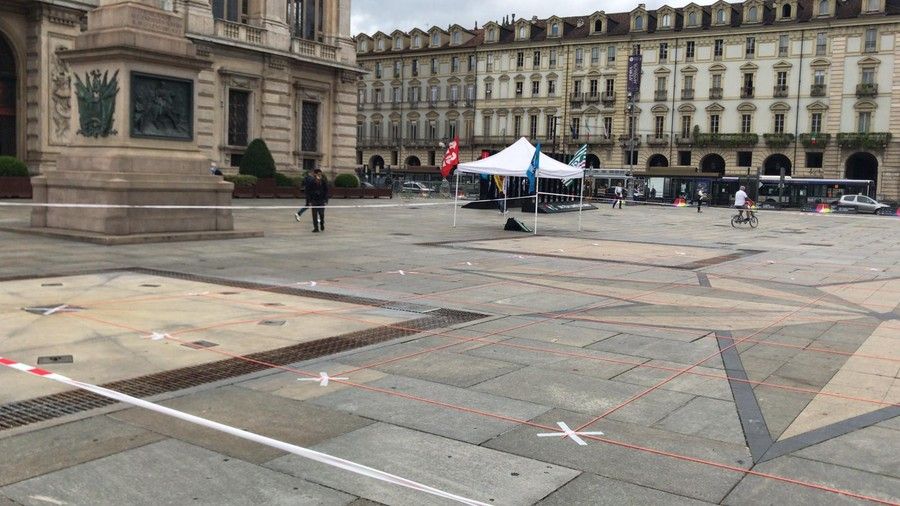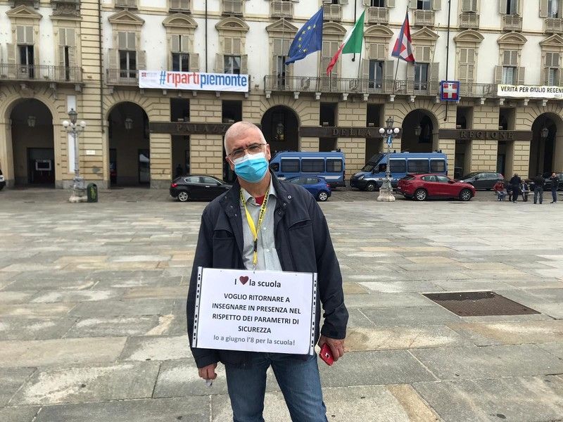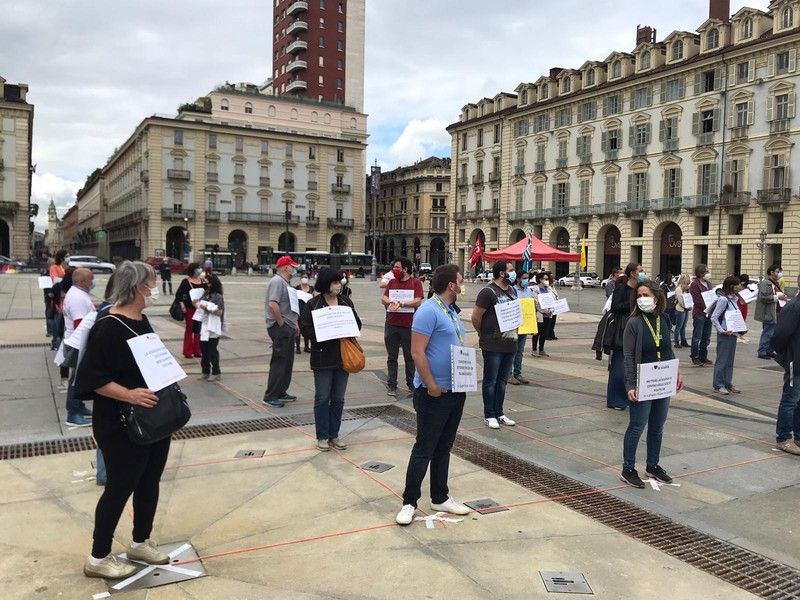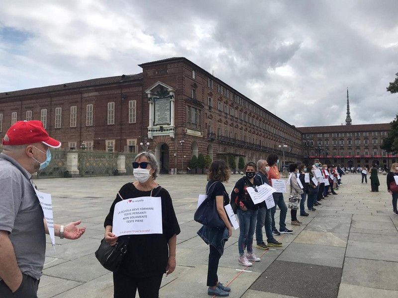 Con un quadro disegnato al centro di piazza Castello e persone rigorosamente a 2 metri di distanza, i manifestanti hanno reso l’idea di quanto sia difficile garantire agli studenti che a settembre rientreranno a scuola le distanze. “Basta guardare alle mie spalle. 50 persone, 2 classi: quel quadrato lì in mezzo è 256 metri quadri, quale scuola è in grado di garantire uno spazio simile?” afferma Massimiliano Rebuffo, segretario generale  Cgil. “O si investe in strutture, o in organici o settembre saremo costretti a tagliare il 50% del quadro orario. Non ci sono alternative” spiega.