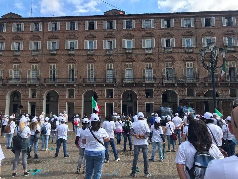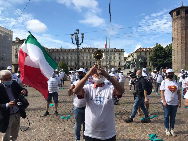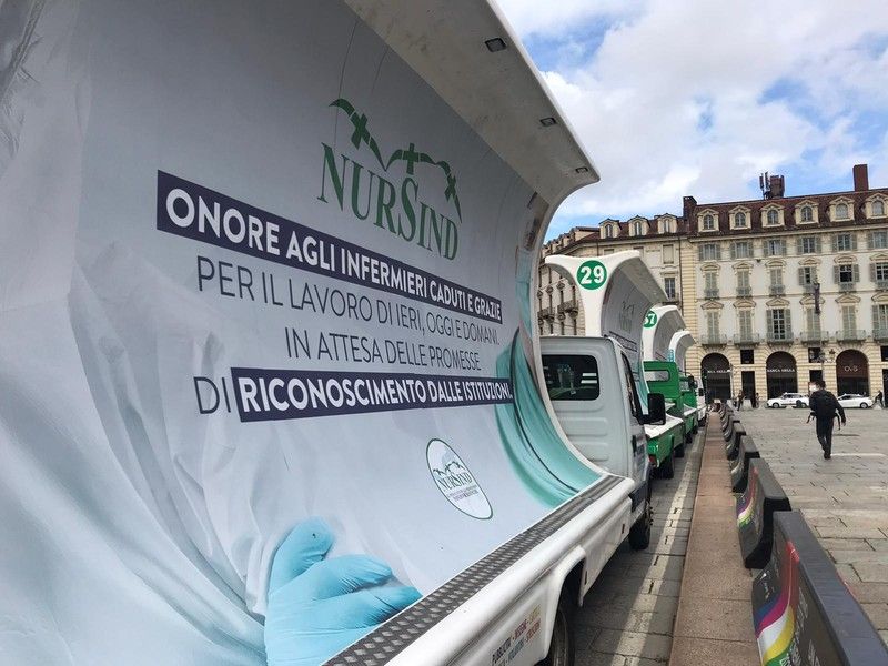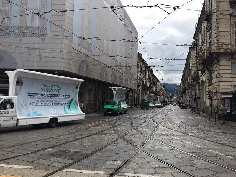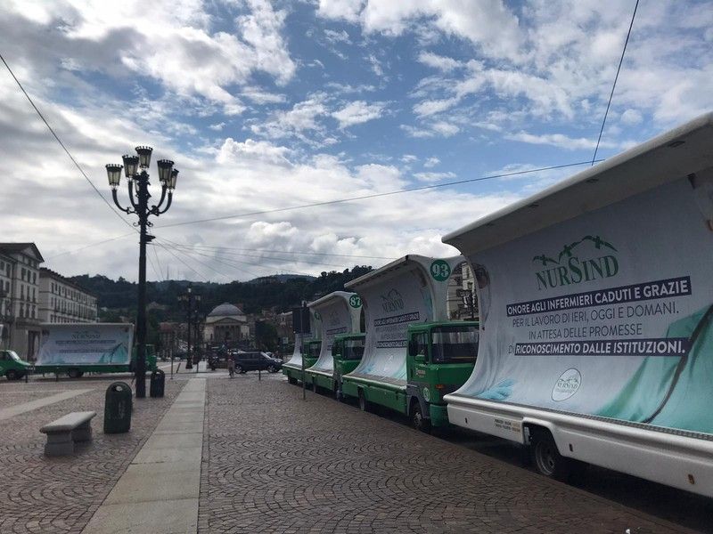 Il suono di una tromba per ricordare gli oltre 40 infermieri deceduti a causa del Coronavirus e una lunga fila di camion per chiedere al Governo di rispettare gli impegni presi e rivedere le condizioni di lavoro di tutta la categoria. E’ una doppia e distinta protesta quella messa in atto oggi, tra piazza Vittorio e piazza Castello, dagli infermieri torinesi.