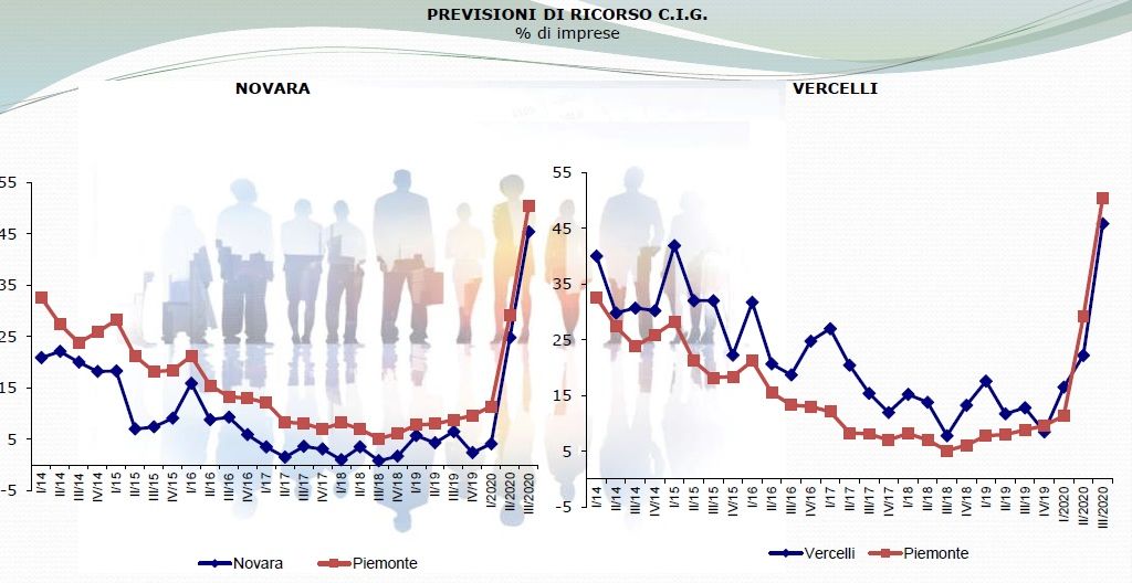 Il saldo ottimisti/pessimisti relativo alle aspettative di nuova occupazione registra un miglioramento a Novara (-0,8 punti, rispetto ai precedenti -8,1) mentre a Vercelli peggiora, da -1,1 a -8,1 punti, in linea con il calo piemontese (da -6,7 a -12,6 punti). La percentuale di imprese che dichiara l’intenzione di ricorrere alla Cassa integrazione guadagni (Cig) raggiunge i massimi storici, con il passaggio dal 24,8% al 45,4% a Novara e dal 22,2% al 45,8% a Vercelli, mentre in Piemonte l’incremento è dal 31,9% al 50,4%. «Come avevamo già rilevato nella precedente indagine – osserva il direttore di Cnvv, Aureliano Curini – il massiccio ricorso agli ammortizzatori sociali sta arginando l'impatto della crisi sul mercato del lavoro, ma non essendoci alcuna prospettiva per i prossimi mesi rischiamo conseguenze devastanti anche su questo fronte, soprattutto in caso di una ripresa dell’epidemia».
