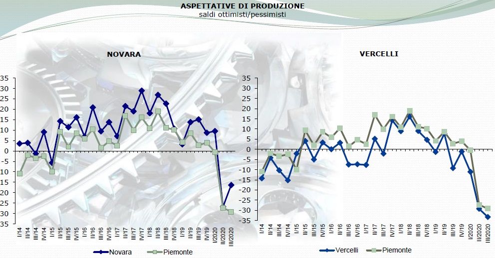 È un’estate all’insegna del pessimismo per l’industria delle province di Novara e di Vercelli. Secondo le previsioni congiunturali di Confindustria Novara Vercelli Valsesia (Cnvv) per il trimestre luglio-settembre 2020 (disponibili sul sito www.cnvv.it) il saldo tra la percentuale degli imprenditori che, rispetto al trimestre precedente, si dichiarano ottimisti e quella di coloro che sono pessimisti sull’incremento della produzione rimane negativo, anche se con una notevole differenza tra i due territori: in quello novarese, infatti, il dato risale da -26,8 a -16,4 punti, mentre in quello vercellese cala da -29,3 a -33,3 punti, con una media regionale a -29,2 punti rispetto ai precedenti -27,3.