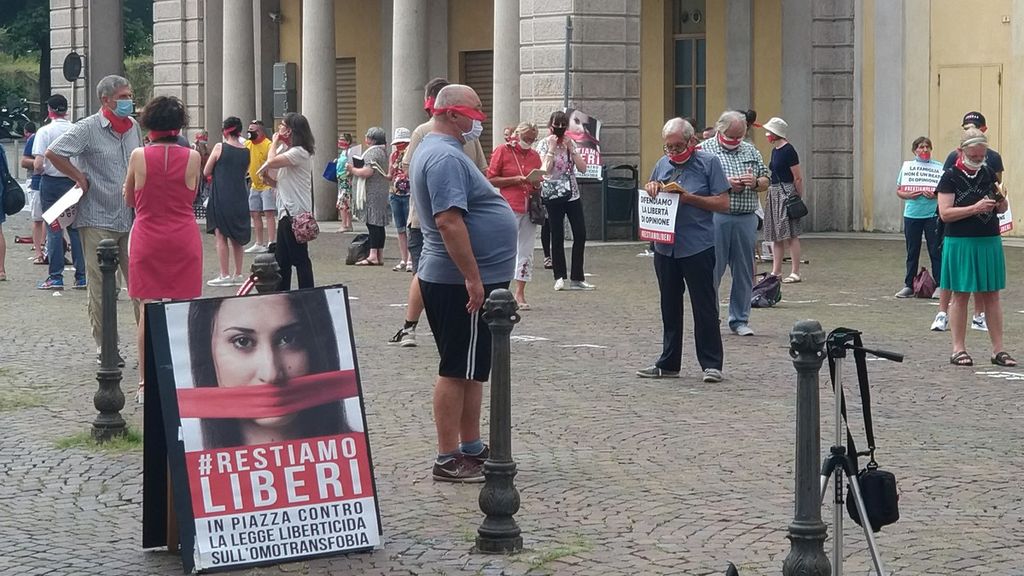 Tutto tranquillo anche alla terza manifestazione in programma in contemporanea, quella del cartello di organizzazioni che si oppone all’approvazione della legge contro l’omotransfobia, che si è svolta in piazza Puccini, nei pressi del teatro Coccia. Qui con lo slogan “Restiamo liberi” una cinquantina di persone, che portavano un bavaglio rosso, hanno manifestato contro il disegno di legge firmato dal deputato Pd Alessandro Zan.