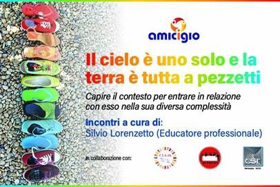 Amicigio da anni lavora per un’inclusione reale fra i membri di uno stesso gruppo, propone con ‘Il cielo è uno solo e la terra è tutta a pezzetti’ di camminare insieme per qualche ora, usando le scarpe degli altri, imparando a conoscere e riconoscere i nostri passi. Gli incontri sono a cura di Silvio Lorenzetto, educatore professionale e accompagneranno i partecipanti verso la serata in compagnia per condividere un po’ del proprio e renderlo importante per tutti.