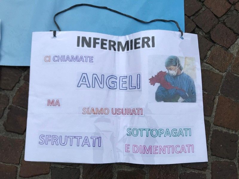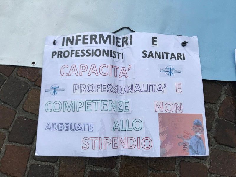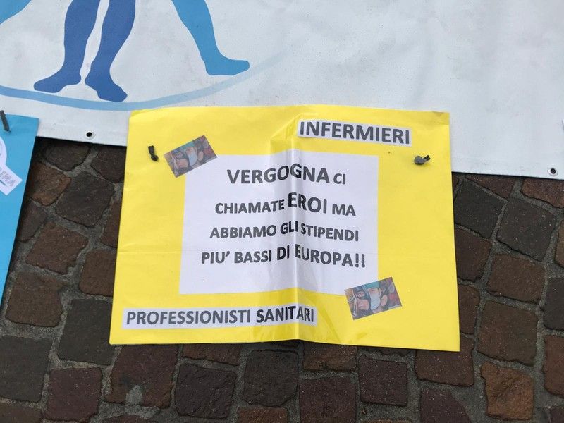 “Vergogna, ci chiamate eroi ma abbiamo gli stipendi più bassi d’Europa”. Nemmeno la pioggia ferma la rabbia degli infermieri legata al sindacato Nursing Up che questa mattina sono scesi in piazza per chiedere un aumento di stipendio e l’uscita dal comparto, che permetterebbe loro di avere un contratto autonomo per la categoria.