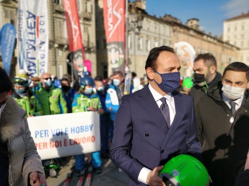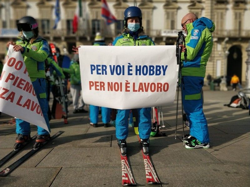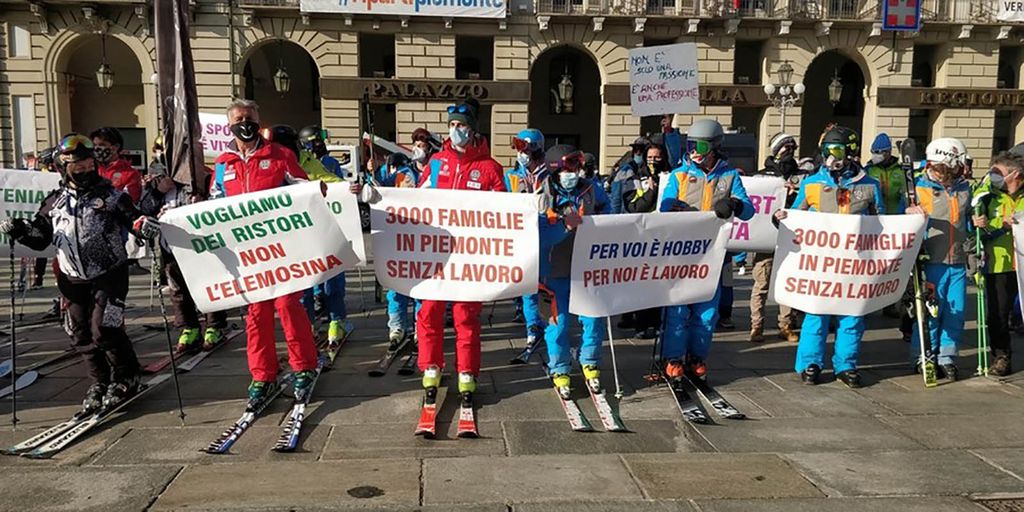 Centinaia di maestri di sci, con abbigliamento tecnico e sci ai piedi, si sono ritrovati stamattina sotto la sede della Regione Piemonte, a Torino, per chiedere la riapertura delle piste e la possibilità di lavorare durante le feste di Natale.
