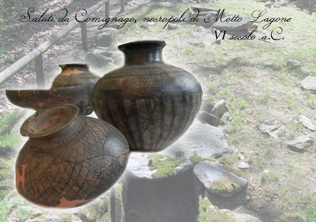 Spostandoci ora sul territorio, vi inviamo una cartolina speciale, da una zona dell’area protetta dei Lagoni. Siamo a Comignago, precisamente al Motto Lagone. Sulla sommità del rilievo oggi compreso nell’area protetta nel 1971 è stata ritrovata una sepoltura della prima età del Ferro a cassetta litica, violata ma contenente ancora una fusaiola e frammenti ceramici a stralucido di VI-V secolo a.C. Nel 1972 è seguita un’indagine archeologica a tappeto, che ha portato al ritrovamento di una piccola necropoli composta da una decina di tombe a inumazione in fosse rivestite da lastre o ciottoli di pietra. I corredi presentano vasellame ceramico acromo o a stralucido (fiasche, ciotole, bicchieri) e parures in bronzo, composte da anelli, bracciali, placche da cintura, pendagli, fibule, talvolta decorate con coralli e perle d’ambra e pasta vitrea.