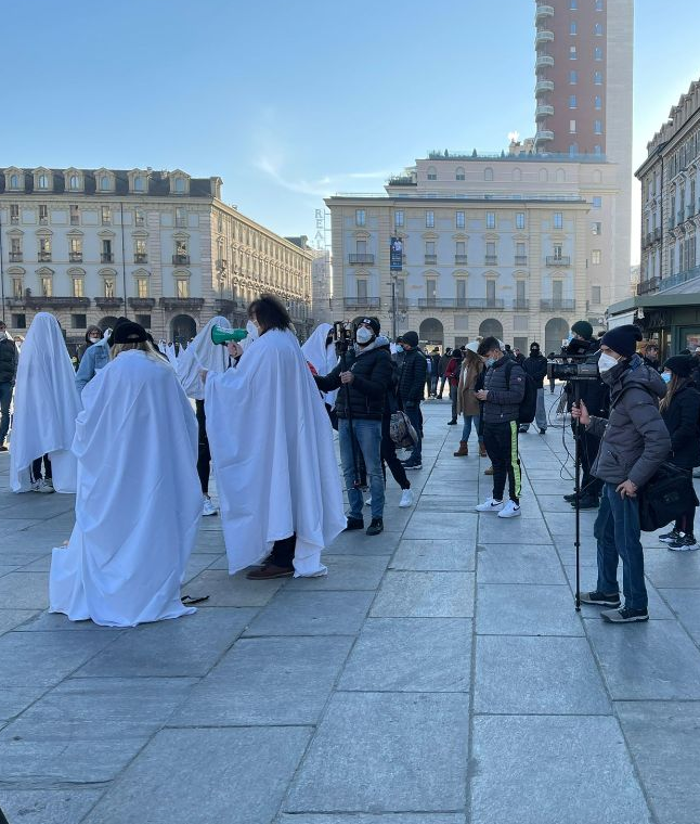 Se le mascherine hanno coperto i nostri volti in questi mesi difficili, oggi davanti alla Regione Piemonte gestori di palestre, istruttori di ginnastica, personal trainer hanno scelto di coprire i corpi, loro strumenti di lavoro, scendendo in piazza Castello per manifestare a favore di un settore che sembra diventato “invisibile” durante l’emergenza Covid.