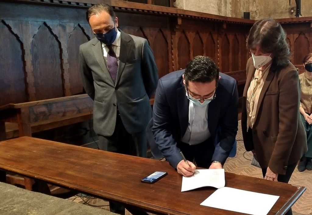 Alla firma ha assistito anche il presidente della Regione Piemonte Alberto Cirio, a Novara per una visita al Teatro Coccia.