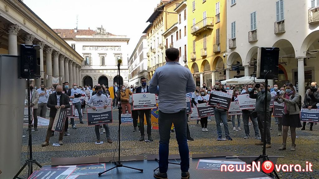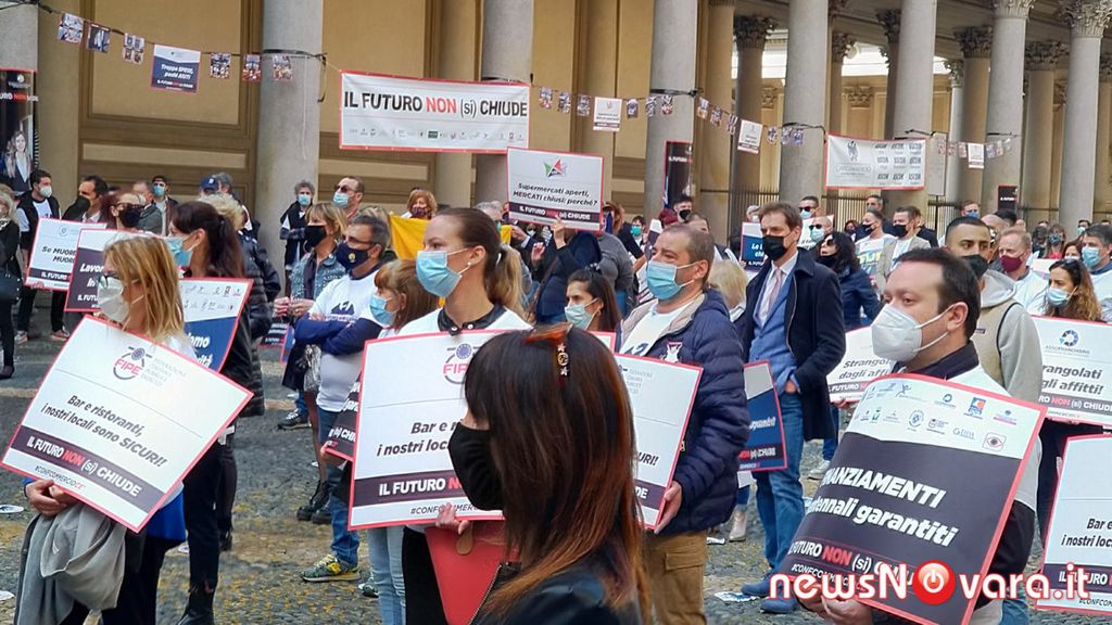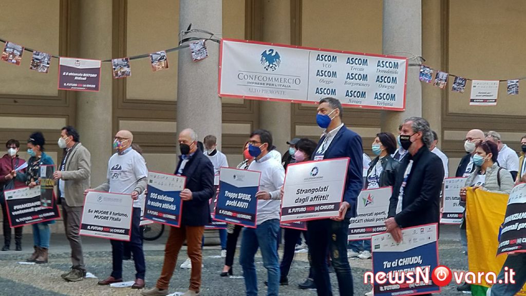 Qualche momento di tensione – subito rientrato - questa mattina a Novara dove i commercianti aderenti a Confcommercio Alto Piemonte sono scesi in piazza per protestare per il prolungarsi delle chiusure e per l’esiguità dei ristori decisi dal governo. Una piazza gremita e molto nervosa soprattutto nei confronti del governo e con i politici in generale.