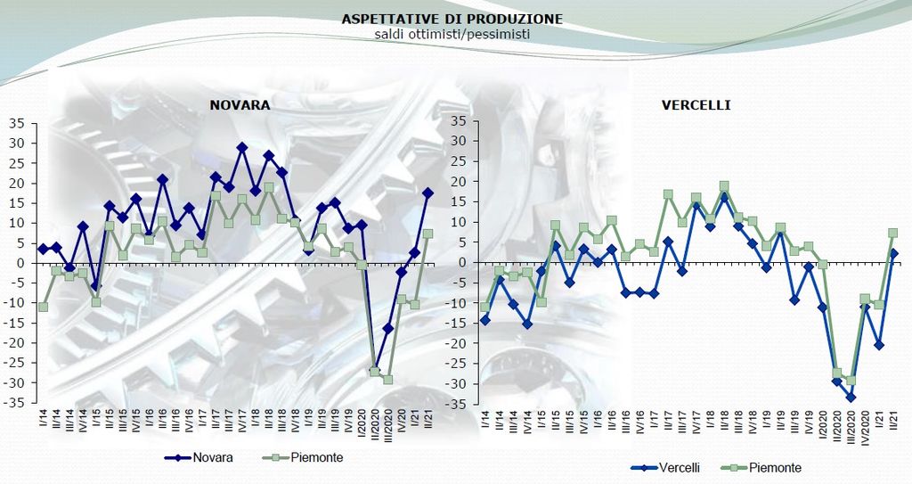 Migliorano le prospettive per l’industria delle province di Novara e di Vercelli. Secondo le previsioni congiunturali di Confindustria Novara Vercelli Valsesia (Cnvv) per il trimestre aprile-giugno 2021 (disponibili sul sito www.cnvv.it) il saldo tra la percentuale degli imprenditori che si dichiarano ottimisti e quella di coloro che sono pessimisti sull’incremento della produzione registra crescite importanti in entrambi i territori, posizionandosi a 17,5 punti nel Novarese (rispetto ai precedenti 2,6) e a 2,2 punti in provincia di Vercelli (rispetto ai precedenti -20,4), con una media regionale che risale a 7,3 punti a fronte dei -10,5 del primo trimestre dell’anno. Lo stesso trend è seguito dal saldo ottimisti/pessimisti riferito alle attese di nuovi ordini totali, a 12,7 punti nel Novarese (rispetto ai precedenti 1,7) e a 7,8 nel Vercellese (rispetto ai precedenti -23,7). Migliora anche l’indicatore piemontese, a 5,8 punti rispetto ai -12,2 dello scorso trimestre.