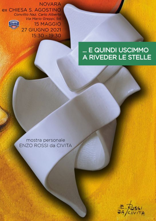 Enzo Rossi da Civita rappresenta, quindi, l’artista per eccellenza per essere accolto tra le mura di così tanto pregio e tanta storia. La mostra dal titolo “ E quindi uscimmo a riveder le stelle “ intende richiamare non solamente il Sommo poeta Dante Alighieri, del quale si celebra in questo anno la ricorrenza, ma anche il “ cosmo “ nel quale tutto fluttua e tutto si trasforma secondo delle regole ben precise. È stata questa la filosofia artistica del Maestro Enzo Rossi da Civita ed è quella che si ritrova costantemente nelle sue, quantomai attuali, opere. L’astratto in moto in uno spazio vincolato e che risponde ad una unica identità: il Divino. È così per le sue tele come per le splendide sculture, in legno o acciaio, che diventano materia leggera ed in movimento costante ed imperterrito. Appunto come “ le stelle “ del Sommo Dante.