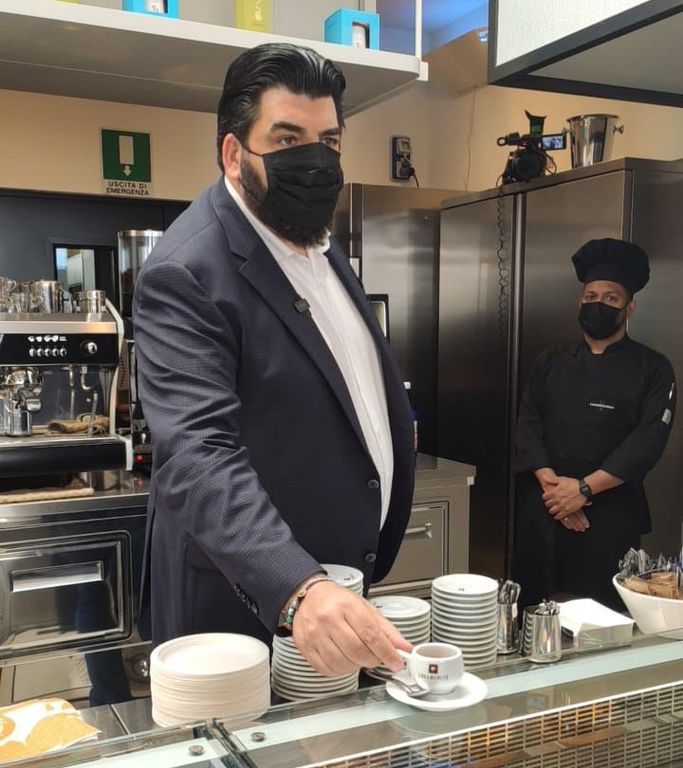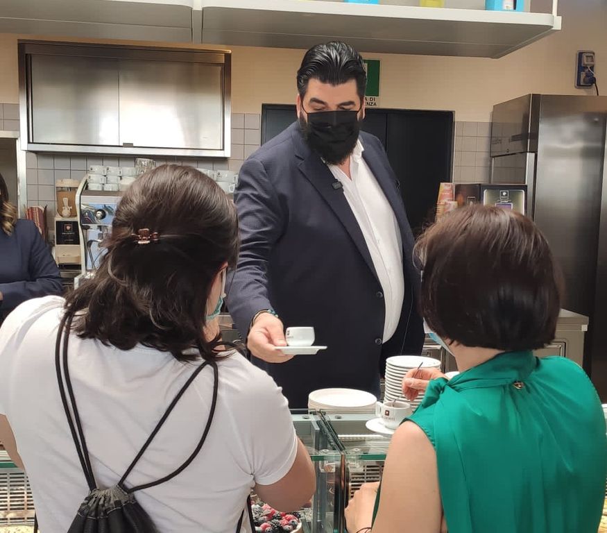 I presenti che, nel varcare la soglia del locale, per godersi una pausa di gusto, hanno avuto la fortuna di imbattersi inaspettatamente nello chef campano e nella sua simpatia, lo hanno salutato con sorrisi e calore. Non sono mancati i selfie di rito, rigorosamente con mascherina.