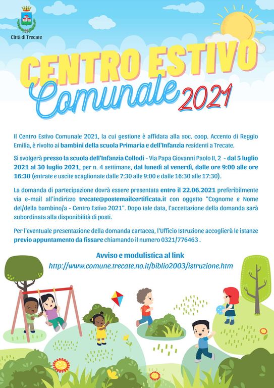 Il Centro Estivo Comunale 2021, la cui gestione è affidata alla soc. coop. Accento di Reggio Emilia, è rivolto ai bambini della scuola Primaria e dell’Infanzia residenti a Trecate.