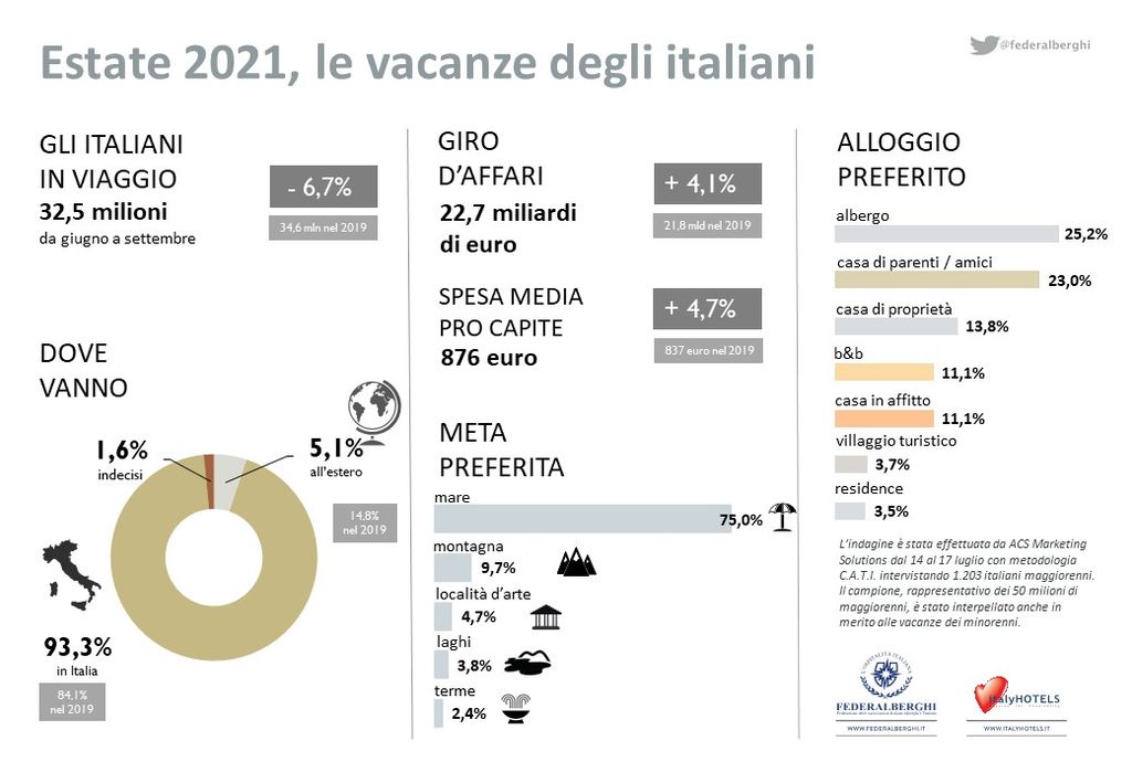 Nella valutazione di una possibile ripresa, è importante notare che la durata media della vacanza principale degli italiani si attesta sulle 10 notti rispetto alle 9 del 2020 e conseguentemente la spesa pro capite raggiunge gli 876 euro, contro i 673 euro dello scorso anno.