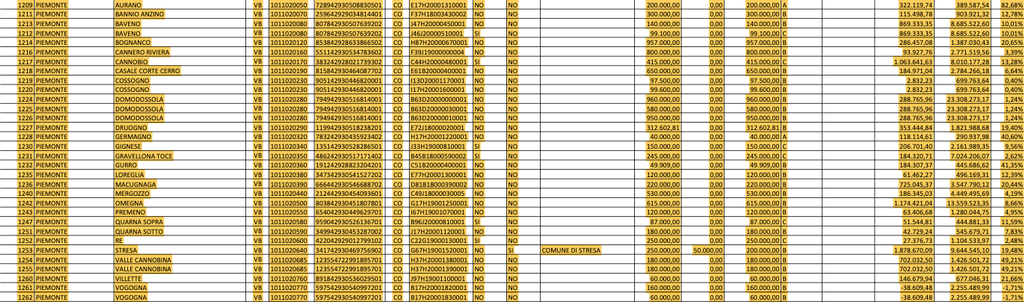 I Comuni beneficiari del Vco sono 26, 30 quelli del Novarese (l'elenco completo dei Comuni e degli importi è visibile, evidenziato in giallo, nell'allegato in fondo all'articolo).