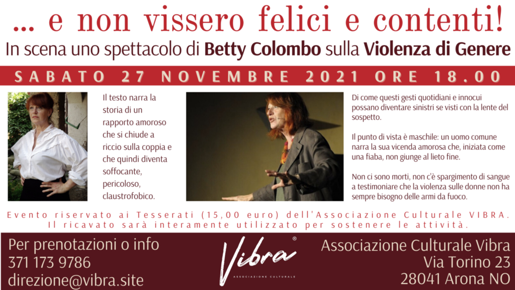 Sabato 27 novembre 2021 alle ore 18.00 presso il Micro Teatro dell’Associazione Culturale VIBRA di Arona, andrà in scena uno spettacolo di Betty Colombo sulla Violenza di Genere.