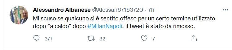 E poi ancora : “Mi scuso se qualcuno si è sentito offeso per un certo termine utilizzato dopo "a caldo" dopo #MilanNapoli, il tweet è stato da rimosso”.
