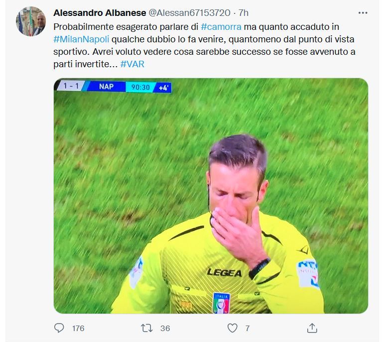 Nel frattempo, vista la mole di commenti e post in cui moltissime persone hanno dimostrato la propria indignazione Albanese ha cancellato il post della discordia ed ha scritto, sempre tramite Twitter, le proprie scuse: “Probabilmente esagerato parlare di #camorra ma quanto accaduto in #MilanNapoli qualche dubbio lo fa venire, quantomeno dal punto di vista sportivo. Avrei voluto vedere cosa sarebbe successo se fosse avvenuto a parti invertite... #VAR”.