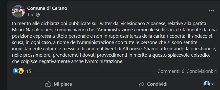 Il Comune di Cerano ha pubblicato sul proprio profilo Facebook un post in cui l’ente si dissocia dal proprio vice sindaco: “In merito alle dichiarazioni pubblicate su Twitter dal vicesindaco Albanese, relative alla partita Milan-Napoli di ieri, comunichiamo che l’Amministrazione comunale si dissocia totalmente da una posizione espressa a titolo personale e non in rappresentanza della carica ricoperta. Il sindaco si scusa, in ogni caso, a nome dell'Amministrazione con tutte le persone che si sono sentite ingiustamente colpite e messe a disagio dal tweet di Albanese. Stiamo affrontando la questione e, nelle prossime ore, prenderemo i dovuti provvedimenti in merito a questo spiacevole episodio, che colpisce negativamente anche l'Amministrazione”.