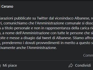 Il Comune di Cerano ha pubblicato sul proprio profilo Facebook un post in cui l’ente si dissocia dal proprio vice sindaco: “In merito alle dichiarazioni pubblicate su Twitter dal vicesindaco Albanese, relative alla partita Milan-Napoli di ieri, comunichiamo che l’Amministrazione comunale si dissocia totalmente da una posizione espressa a titolo personale e non in rappresentanza della carica ricoperta. Il sindaco si scusa, in ogni caso, a nome dell'Amministrazione con tutte le persone che si sono sentite ingiustamente colpite e messe a disagio dal tweet di Albanese. Stiamo affrontando la questione e, nelle prossime ore, prenderemo i dovuti provvedimenti in merito a questo spiacevole episodio, che colpisce negativamente anche l'Amministrazione”.