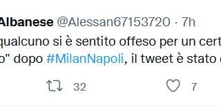 E poi ancora : “Mi scuso se qualcuno si è sentito offeso per un certo termine utilizzato dopo "a caldo" dopo #MilanNapoli, il tweet è stato da rimosso”.