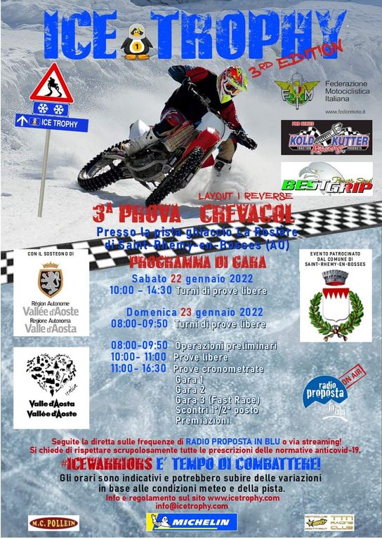 L’inverno è il momento in cui, solitamente, i piloti riducono l’attività sportiva e si dedicano alla programmazione della stagione successiva. Da tre anni a questa parte, però, grazie all’impegno del Motoclub Ttn Racing Club di Novara e del Motoclub Pollein di Aosta –supportati dalla Federazione motociclistica italiana– gli atleti possono sfidarsi a suon di traversi sui tracciati dal fondo ghiacciato dell’Ice Trophy 2021-2022. A Crevacol, questo fine settimana, terza tappa dell'Ice Trophy. Sabato 22 le prove libere, il giorno successivo le gare. Così il presidente del Mc Ttn Racing Club Alessandro De Gregori: “Dopo la tappa sofferta, causa Covid, di Pragelato, proseguiamo il compito istituzionale affidatoci mantenendo vive le competizioni, nonostante le molte defezioni legate alla pandemia in corso. Grazie al nostro gruppo e ai volontari, possiamo tenere aperto il gas per guardare oltre la curva dei contagi, per uscirne da motociclisti”. Per partecipare è sufficiente la licenza Fmi 2022, una moto o un quad, gomme chiodate e, soprattutto, tanta voglia di divertirsi. Le regole sono molto semplici. In base alla tipologia di moto utilizzata, i partecipanti saranno divisi in varie categorie per affrontare prima delle prove libere e poi delle qualifiche ufficiali. I tempi fatti registrare da ciascun partecipante serviranno per stabilire i piloti che, due alla volta, si confronteranno sul tracciato nelle diverse sfide. Si potrà partecipare alle gare individualmente o come team formato da due piloti che si alterneranno alla guida. Per info: www.icetrophy.com – info@icetrophy.com, 320.3383708 – 338.6197632