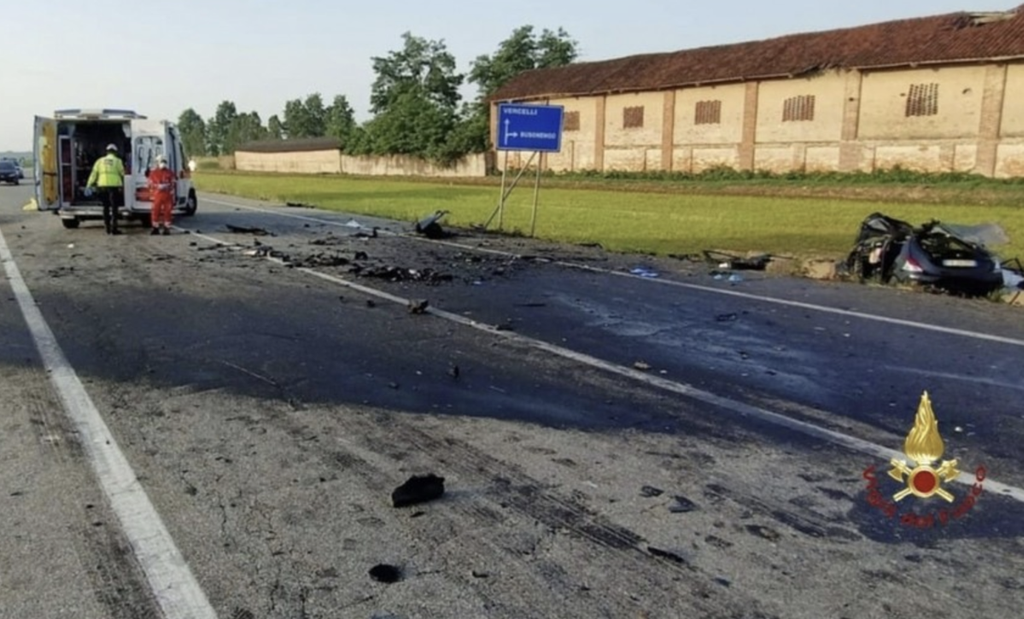 R.P., A.M., e C.M. erano a bordo di una LanciaY condotta da un 21enne, trasportato in gravissime condizioni a Novara: sarebbe in pericolo di vita. Per cause al vaglio delle forze dell'ordine, la vettura si è schiantata contro una Bmw condotta da un 29enne che viaggiava in direzione opposta. La Y10 è finita in risaia, con il muso completamente distrutto. Fuori strada anche la Bmw, condotta da un 29enne ricoverato in codice giallo a Vercelli.