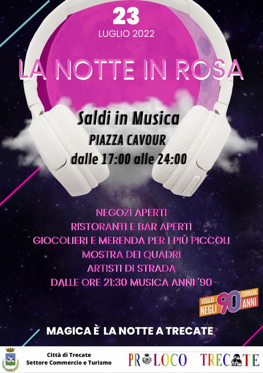 L’assessora al Commercio Fortunata Patrizia Dattrino spiega che "l’Amministrazione ha voluto sostenere i negozianti organizzando manifestazioni popolari che li potessero coinvolgere in maniera diretta, rendendoli protagonisti e non semplici aderenti. I Trecatesi avranno l’opportunità di fare shopping approfittando delle occasioni legate ai saldi di fine stagione in un’atmosfera coinvolgente: proprio come con il noto format de 'La notte rosa', adottato, con grande successo, in numerose località italiane, i negozi, i bar e i ristoranti terranno le serrande alzate fino alle 24: il colore rosa sarà il filo conduttore che legherà tutte le attività commerciali che, con il loro lavoro e la loro creatività, contribuiranno a rendere la città più attrattiva, viva e vitale. Il Settore Commercio ha provveduto all’allestimento delle vie chiuse puntando sul colore distintivo della manifestazione e lo stesso avverrà per le vetrine. Inoltre ristoratori e baristi – che avranno, tra l’altro, l’opportunità, di estendere i propri dehor – prepareranno piatti particolari, apertivi e cocktail lasciandosi ispirare dal rosa. La manifestazione non riguarderà solo le ore serali: il vero e proprio inizio è previsto infatti per le 17 in piazza Cavour, pensando in primo luogo ai bambini trecatesi, ai quali sarà offerta una merenda e per i quali sarà presente un giocoliere per momenti di divertimento. Per tutto il tempo le vie saranno animate dall’esibizione di alcuni artisti di strada. In particolare, in via Mazzini saranno esposte le moto del Moto Club 'Berta e friends' e le auto di 'Mcars' e sarà inoltre possibile visitare la mostra di quadri a cura del pittore trecatese Riccardo Borando dei suoi allievi".
