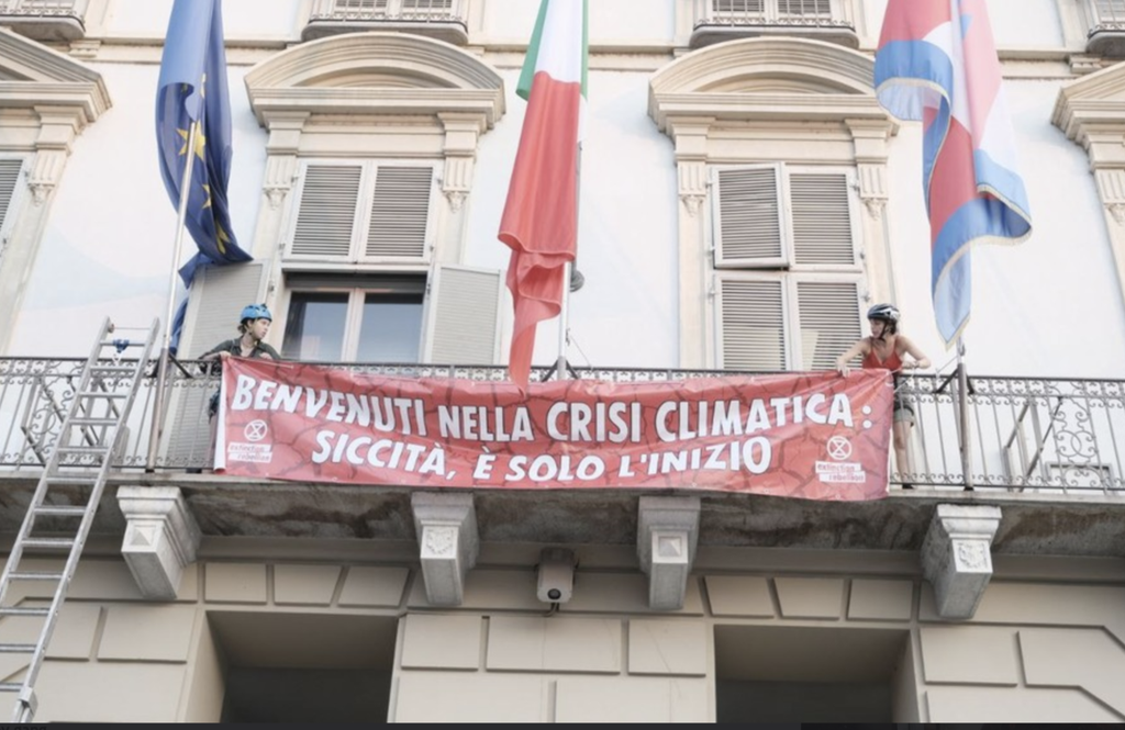 Questa mattina, poco dopo l'alba, due attiviste di Extinction Rebellion sono salite sul balcone del Palazzo della Regione in piazza Castello e hanno appeso un grande striscione con scritto "Benvenuti nella crisi climatica. Siccità, è solo l'inizio". Poi si sono incatenate alle ringhiere.