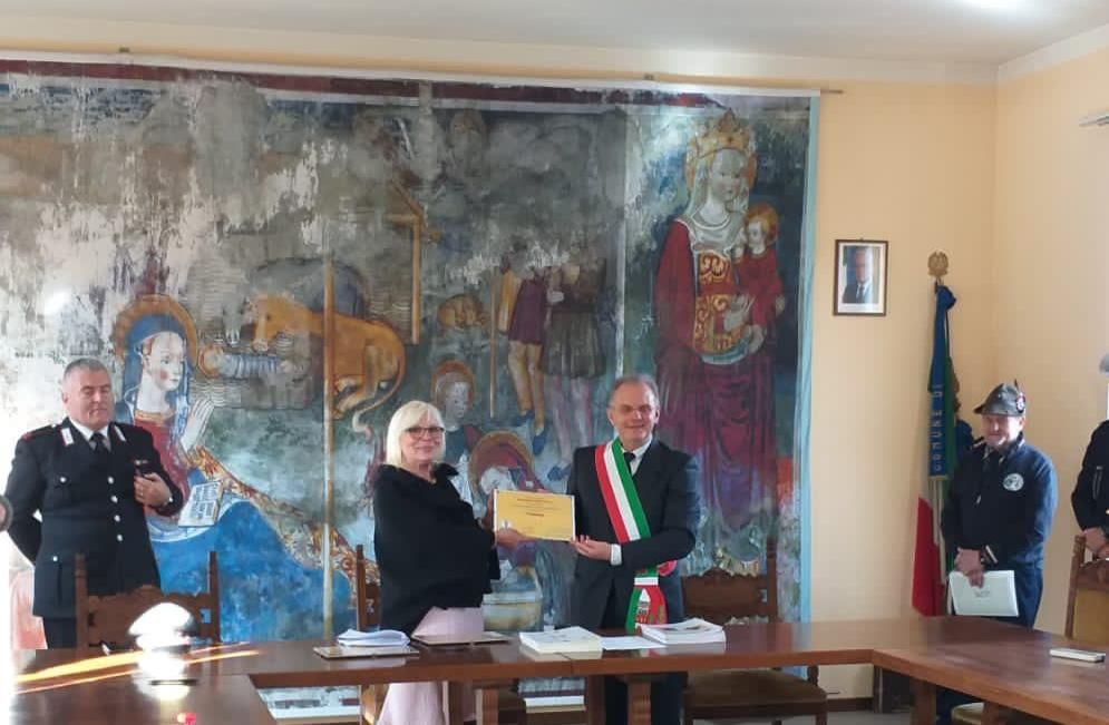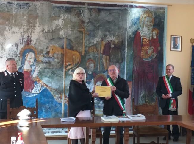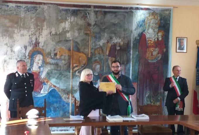 Illustrando poi la mission di Toponomastica Femminile, in relazione al grande riscontro d'interesse conseguito dalla mostra “Le Madri Costituenti”, la Referente di Toponomastica femminile ha ringraziato i Sindaci a nome della Presidente, consegnando loro la targa di riconoscenza.