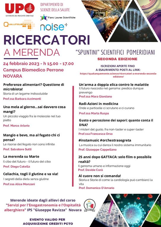 Torna, venerdì 24 febbraio, con l’inedita collaborazione dell’Alberghiero Ravizza di Novara, “Ricercatori a merenda Spuntini scientifici pomeridiani, l’evento di divulgazione scientifica a cura del Dipartimento di Scienze della Salute dell’UPO di Novara rivolto agli studenti delle scuole superiori per avvicinare i giovani alla Scienza.
