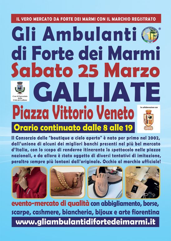 Gli Ambulanti di Forte dei Marmi: le bancarelle del mercato di qualità più famoso d’Italia tornano finalmente nel Novarese, a grandissima richiesta, con tutto il meglio del Made in Italy artigianale e le ultime tendenze della moda. Si potranno ammirare le ormai mitiche “boutique a cielo aperto” dell’originale Consorzio sabato 25 marzo a GALLIATE (nella stupenda location di Piazza Vittorio Veneto con il Castello Sforzesco) in un evento in collaborazione con la Pro Loco. Dunque, un appuntamento da non perdere assolutamente per i tanti appassionati del genere, come sempre all’insegna dello shopping più glamour e conveniente, con orario continuato, anche in caso di maltempo, dalle 8 alle 19.