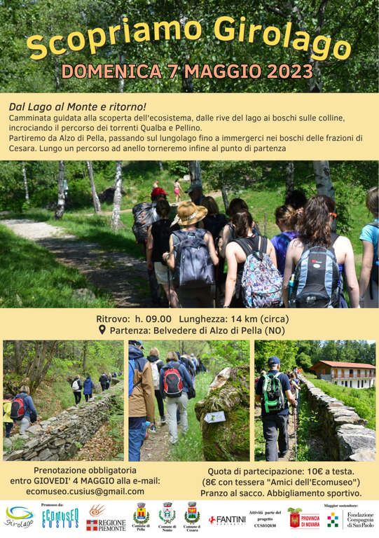 L’attività si svolgerà domenica 7 maggio 2023. Il ritrovo è fissato alle ore 09:00 presso Alzo di Pella con registrazione dei partecipanti e partenza a piedi. Sono consigliate scarpe comode per camminare e un abbigliamento adatto, eventualmente bastoncini da trekking. Pranzo al sacco.