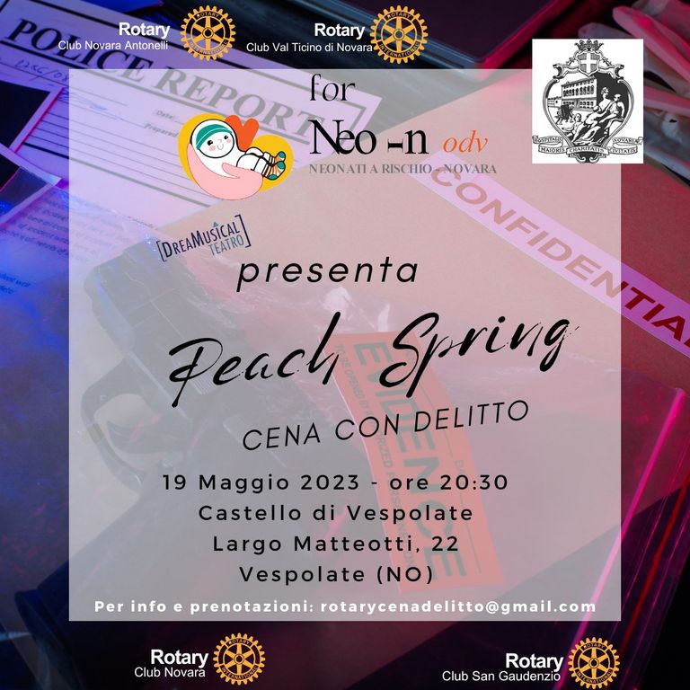 Il 19 maggio alle 20.30 presso il castello di Vespolate: “Cena con delitto”, iniziativa benefica organizzata dal “Rotary Club Novara Antonelli”, supportata dagli altri Rotary di Novara a sostegno di Neo-n, l’associazione di volontariato che da diversi anni rappresenta una presenza importante ed un aiuto per il reparto di terapia intensiva neonatale e pediatrica e per le famiglie dei piccoli "grandi" ricoverati in reparto.