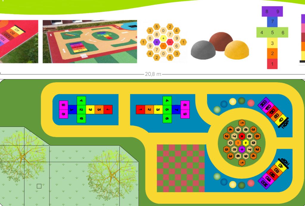 A terra saranno realizzati una serie di giochi: 10 sfere in gomma sintetica che creano un percorso di equilibrio, 2 giochi della campana, 2 aree di salto in lungo, un gioco “Jump calculator” e una scacchiera gigante. Costo dell'opera: 48 mila euro, che sono stati ricavati da una serie di risparmi e di ribassi d'asta all'interno del più grande intervento di risistemazione di tutto il plesso scolastico. Termine dei lavori entro la fine di luglio.