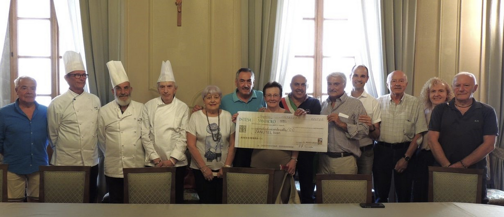 La consegna dell’ assegno nella sala degli specchi di Palazzo Tornielli alla presenza di componenti l’associazione San Bernardo, guidata dal presidente Giuseppe Savoini, degli chef dell’Allegra brigata che hanno cucinato piatti degni della loro professionalità e del sindaco Sergio Bossi.
