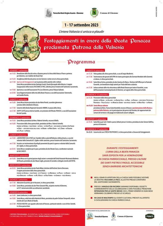 Sabato 2 settembre prossimo, in piazza Antonelli a Ghemme alle ore 17.15, si terrà in. Concerto della Banda Musicale Giovanile del Piemonte, nell’ambito dei Festeggiamenti in onore della Beata Panacea proclamata Patrona della Valsesia. La Nuova Filarmonica Ghemmese, con la collaborazione del Comune e della Parrocchia di Ghemme, ospiterà la formazione creata dall’ANBIMA Piemonte, l’Associazione nazionale delle Bande musicali, composta da oltre sessanta giovani provenienti dalle bande di tutta la Regione, sotto la direzione del maestro Riccardo Armari.