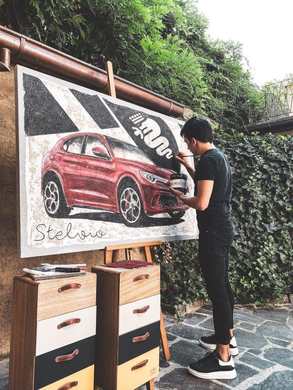 La celebre vettura storica, tra le più ricercate dai collezionisti, datata 1933 e ispirata alle spider inglesi dell’epoca, prenderà forma sulla tela in tutte le sue caratteristiche e peculiarità uniche, grazie all’occhio attento e la mano ferma dell’artista, abituato a riprodurre i soggetti delle sue composizioni in modo accurato e preciso. Dalla coda affusolata ai parafanghi di tipo motociclistico, la FIAT 508S Balilla Coppa d’Oro sarà rappresentata, su spesso sfondo materico impreziosito da sabbia e polvere di quarzo, in stile realistico che strizza l’occhio alla Pop Art.