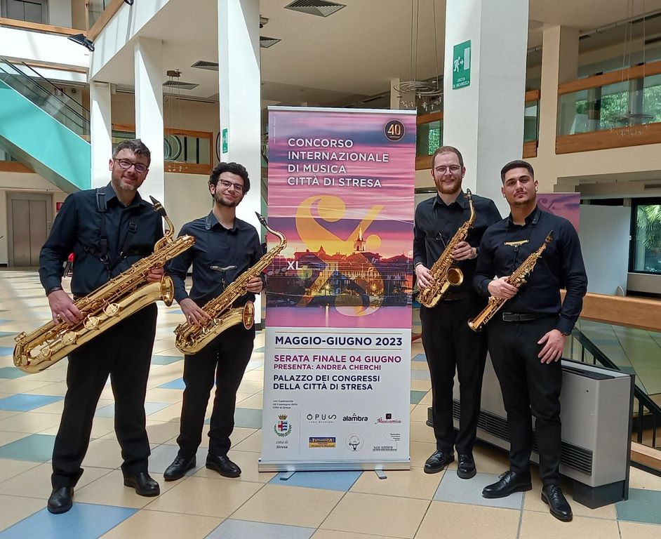 Il quartetto ha recentemente collaborato con maestri d’eccezione del panorama europeo e mondiale quali i saxofonisti Claude Delangle, Gilles Tressos e Antonino Mollica, quest’ultimo culminato in una esibizione del quartetto in Francia presso la Salle de la Music del Conservatorio Nazionale della regione di Aubervilliers/ La Courneuve. Tra i riconoscimenti ottenuti nei concorsi nazionali di musica, il Primo Premio al “23° Premio LAMS Matera” sezione musica da camera e il Primo Premio Assoluto con 98/100 al Concorso Internazionale di Musica Città di Stresa XL Edizione 2023 nella sezione “musica da camera”. Componenti: Giacomo Dipalma, sax soprano; Olivier Puget, sax contralto; Christian Giudici, sax tenore; Mathias Milanolo, sax baritono.