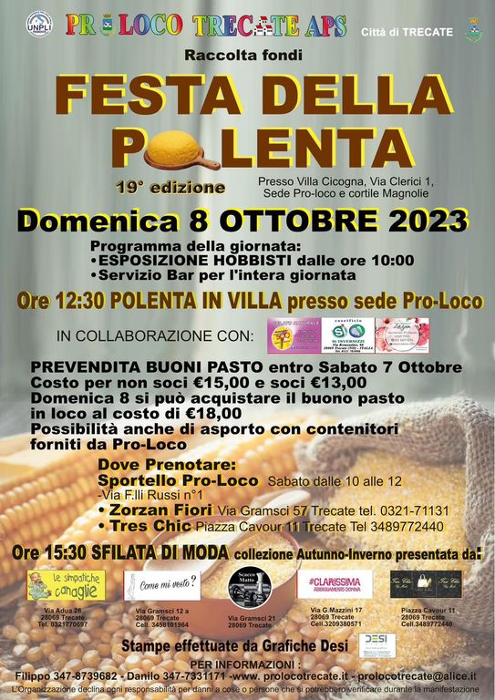 Torna il prossimo 8 ottobre, per la sua diciannovesima edizione, la “Festa della polenta” organizzata dalla Pro Loco con il patrocinio della Città di Trecate.L’iniziativa si svolgerà dalle 10, a Villa Cicogna, con l’esposizione degli hobbisti. Il pranzo è previsto per le 12.30, con possibilità di asporto. Alle 15.30 sfilata di moda con la collezione autunno-inverno.