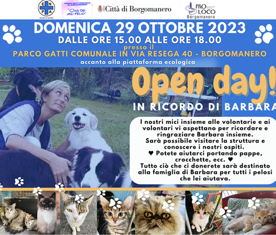 Con il patrocinio del Comune di Borgomanero, in collaborazione con la Pro Loco, l'Associazione Amici dei Gatti Onlus sezione di Borgomanero, Enpa, è organizzato per domenica 29 ottobre 2023 dalle 15 alle 18.00 un "Open Day in ricordo di Barbara Pastori" volontaria recentemente scomparsa.